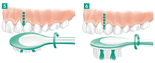 Questa sequenza di movimenti viene ripetuta tre volte per dente e viene sempre eseguita individualmente su ciascun dente. È importante non esercitare troppa pressione.
